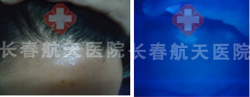 ▲检查:1、多维分型分诊、多维治疗白癜风伍德灯:额部片状色素脱失
